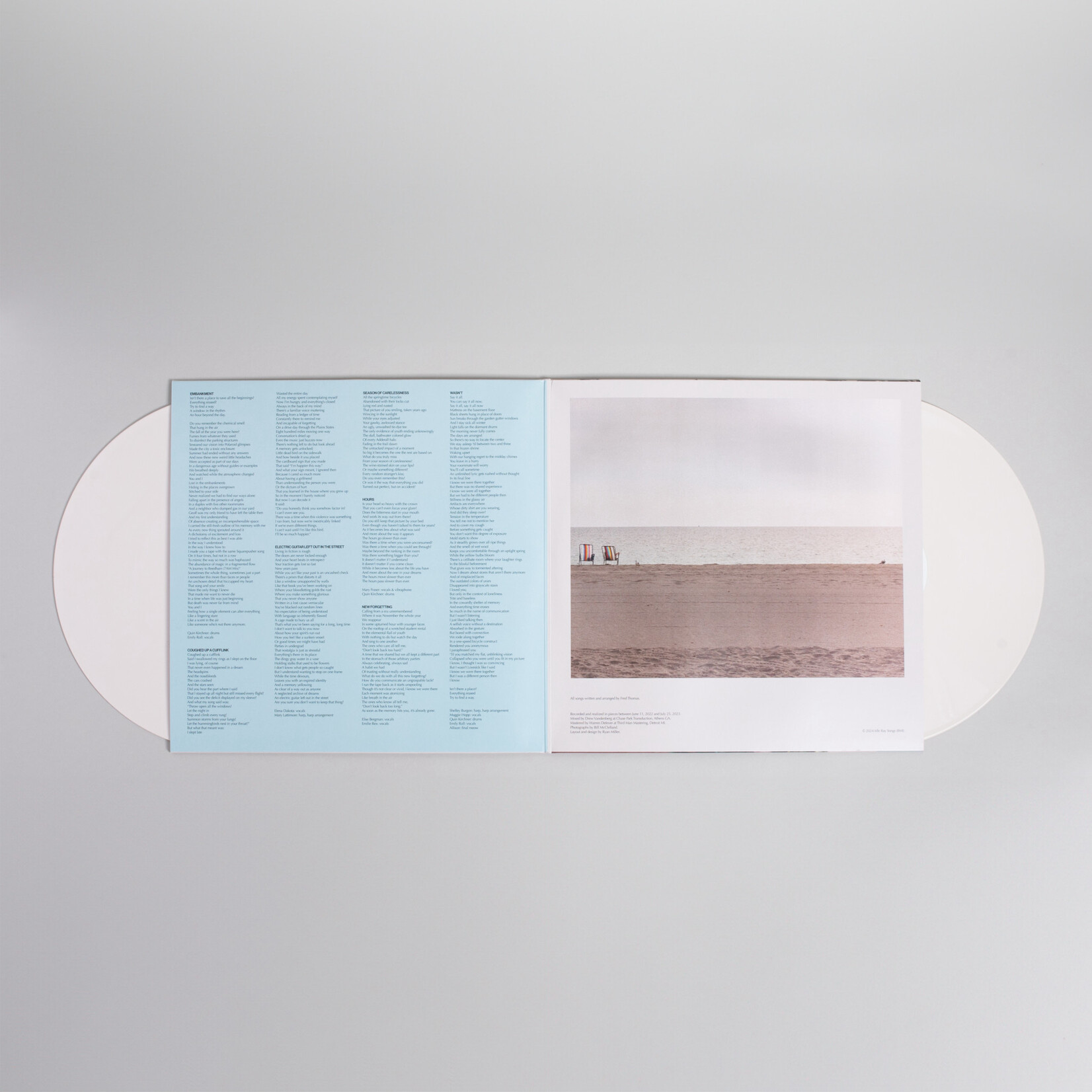 Exactly one hour of music is split up into just seven songs. Having gotten the two-minute pop songs out of his system with his band Idle Ray, Thomas opens up into spacious environments with patient, steady tempos and carefully mapped arrangements. Lonely nylon-string guitars and field recordings transition into enormous, rippling waves of slowcore distortion and buried electronic textures. The mixtape scatter that found the trilogy jumping from guitar blasters to synth instrumentals is streamlined here into a cohesive flow. Drummer/composer Quin Kirchner’s controlled playing guides the rhythms, friends like Raw Honey’s Maggie Hopp, Michigan multi-instrumentalist Mary Fraser, and Australian songwriter Elena Dakota all contribute guest vocals, and not one but two harpists show up; Mary Lattimore weaving ambient softness on one track and Shelley Burgon’s unrelenting double harmonics driving the intensity of another. The album takes its time unpacking itself, with purposeful atmospherics and song construction evoking the same tense brilliance found on Portishead’s Third, Bjork’s Vespertine, or key moments from the Microphones’ early output, and Thomas going deep into his own emotional topography in the same way as Joanna Newsom’s masterful epic Ys. Co-production from long-time collaborator Drew Vandenberg also zeroes in on the details, making for the most polished sound of any of Thomas’ solo work.
